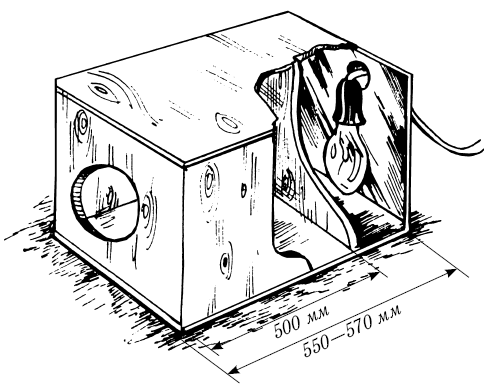 Маточник, обогреваемый электрической лампой. В данном случае в маточнике боковые стены, потолок и пол делают однослойными, а заднюю стену — двухслойной. В задний отсек помещают лампу накаливания мощностью 25 Вт, при этом расстояние от пола до нагревательного элемента должно быть не менее 10 мм. Заднюю стенку изготавливают из жести (рис. 32).