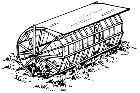 На продольной оси, установленной внутри клетки, закреплен стержень, на который при помощи шарниров крепят навес. Вся конструкция движется в сторону приподнятой части навеса, где видна трава, при этом сам навес остается в одном и том же положении при перекатывании, так как он действует и в качестве противовеса (рис. 33). Вес передвижной клетки не превышает веса кролика в ней.