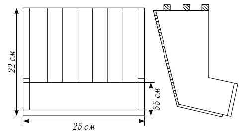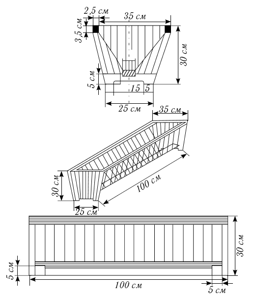 Комбинированная кормушка для крольчат при групповом содержании в длину должна составлять 100 см, в высоту — 40 см, ширина верхней части равна 33–35 см. В нижнюю часть шириной 28 см закладывают концентрированный корм. Такая форма препятствует разбрасыванию корма. По длине кормушки крепят металлические прутья, расположенные на расстоянии 5 см друг от друга, которые на дне закреплены планкой (рис. 36). Такие ясли подходят для травяного и грубого корма.