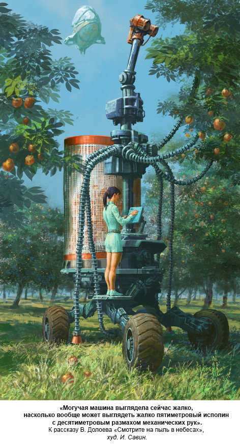Опустившись, наконец, на землю между огромных яблонь, Лада огляделась в поисках уборочного кибера. Тот застыл между двух деревьев, словно в осознании собственной неловкости виновато и недоуменно разведя в стороны манипуляторы. Могучая машина выглядела сейчас жалко, насколько вообще может выглядеть жалко пятиметровый исполин с десятиметровым размахом механических рук. Возле него бестолково толклись казавшиеся совсем маленькими служебные машины.