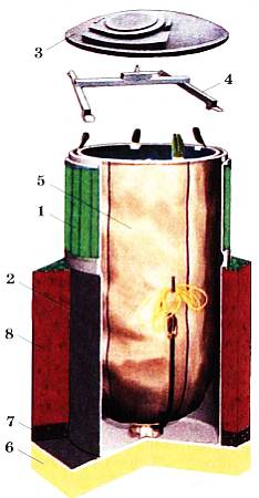 Цифрами на схеме обозначены: 1— облицовка; 2— внешний цилиндр; 3— крышка; 4— подъемное кольцо; 5— съемный мешок; 6— песчаная подушка; 7— бетонные блоки; 8— грунт.