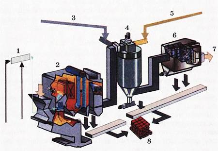 1— паровая смесь; 2— котел; 3— активированный уголь; 4— реактор; 5— нейтрализующие химикаты; 6— фильтр; 7— отвод к дымососу; 8— стройматериалы из отходов.