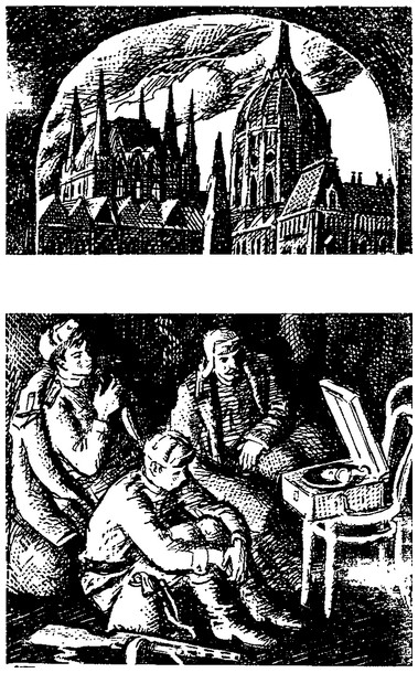 Смеркалось. На улице было тихо. Закончили свою работу и телефонисты, и саперы, искавшие мины. В конце улицы багряно пылало небо. Ласло, дойдя до угла, залюбовался багровыми отсветами, игравшими на куполе и в окнах королевского дворца. Два солдата шли ему навстречу, — наверное, какой-нибудь патруль. Через плечо — автомат, в руках — венгерские палаши наголо. Они шли, громко смеясь и помахивая палашами, словно тросточками.