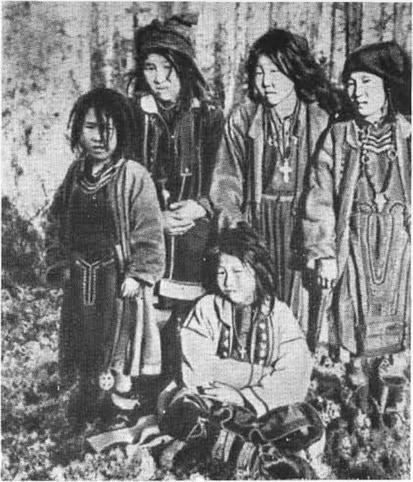 Шаман Николай Дондин и его дочери (фото и подпись к нему В. Шишкова, река Нижняя Тунгуска, 1911 г.)