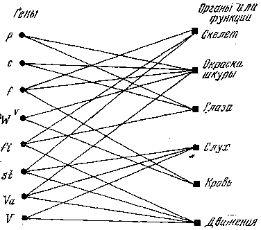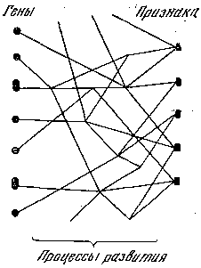 Принципы полимерии (на каждый признак влияют несколько генов) и плейотропии (каждый ген влияет на несколько признаков) были известны с начала века. Это — феноменология всего процесса, наблюдаемый конечный результат. На рис. 4 схематически изображено действие этих принципов в развитии особи. Таких схем даже для не особенно полно изученных генетически видов животных и растений уже полстолетия тому назад можно было составить довольно много, а в наше время — сотни.