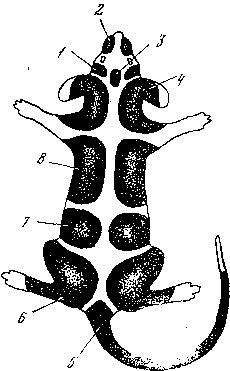 Рис. 9. Зоны действия отдельных генов и групп генов (1–8), определяющих появление разных вариантов окраски покровов млекопитающих