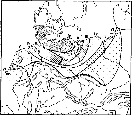 Потом интерес к этому направлению исследований ослабел (главная причина, видимо, заключалась в том, что нерешенные проблемы генетики отвлекли исследователей от широкого изучения популяций в природе), и в 30—40-х годах появились лишь отдельные работы, касающиеся «распределения мутаций» в природных популяциях. Некоторые из этих работ не потеряли своего значения до настоящего времени, как, например, ставшие классическими работы немецкого биолога К. Циммермана (1935–1939) по распределению мутации simplex на коренных зубах обыкновенной полевки в Европе. На рис. 11 видно закономерное понижение концентрации этого признака от некоего центра, расположенного на севере Средней Европы.