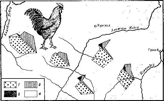 Рис. 12. Феногеография кур Горного Дагестана 1–4 — фены окраски оперения и формы гребня