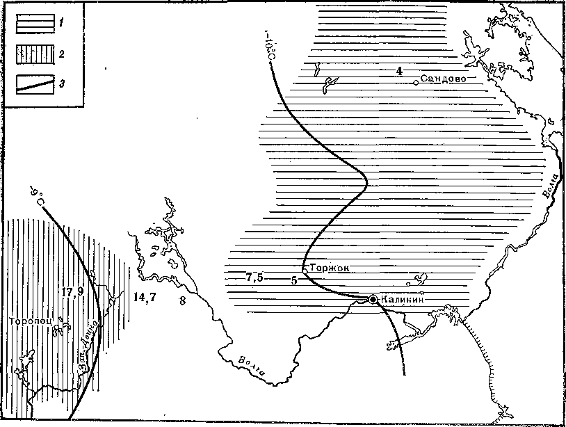 Рис. 13. Концентрация фена «краснохвостости» в популяциях обыкновенной белки в верховьях р. Волги 1 — западная популяция, 2 — северная популяция, 3 — изотерма января