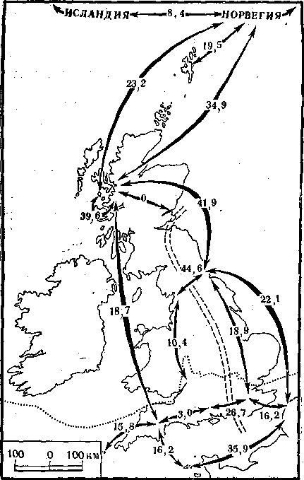 Рис. 16. Фенетические дистанции между популяциями лесных мышей разных районов Великобритании и соседних стран (в условных единицах)