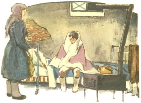 В углу из железной пустой бочки отозвался металлический бас: «хлеба». Витя не узнал своего хриплого голоса. Потрогал рукой горло. Оно начало сильно болеть. Хотелось горячего, хоть бы глоточек кипятку! Но не было ни дров, ни воды. Витя забрался под одеяло, чтобы хоть немного согреться.