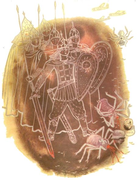 Снится Вите, будто он с ребятами в железных доспехах и блестящих шлемах со звездой. В руках острые сабли. И сражается с фашистами, которых сбрасывают с самолётов; фашисты похожи на пауков. У них гитлеровские усы и прилизанные набок волосы.