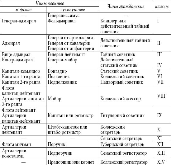 Табель о рангах всех чинов, воинских, статских и придворных, которые в котором классе чины; и которые в одном классе, те имеют по старшинству времени вступления в чин между собою, однако ж воинские выше протчих, хотя б и старее кто в том классе пожалован был 1722 Генваря 24