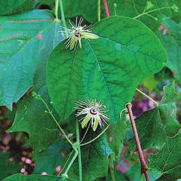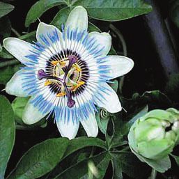 Пассифлора голубая – P. caerulea . Рекомендуется для комнатного содержания. Это мощная лазающая лиана с красивыми блестящими ярко-зелеными листьями и одревесневающими стеблями, которые цепляются за опору с помощью усиков. Усики простые, неразветвленные, располагаются в пазухах листьев. Летом на лиане появляются фантастической красоты цветки. Растение светолюбиво, яркие солнечные лучи очень полезны. Воздух должен быть по возможности достаточно влажным и подвижным. Летом пассифлора голубая несравненно лучше чувствует себя на открытом воздухе и ее хорошо использовать для декорирования балконов и открытых террас. Зимует при температуре не ниже 10 °C. Очень хорошо, если есть возможность держать растение в прохладной оранжерее с умеренным поливом. Рекомендуется ежегодная весенняя пересадка и обрезка. Пассифлоре требуются хорошо дренированные, нейтральные или слабощелочные почвы. Не следует брать слишком питательную землесмесь, так как это может быть причиной не в меру буйного роста в ущерб цветению. Но до августа необходима регулярная подкормка минеральными удобрениями. Поливать растение летом нужно очень обильно, но давая почве просохнуть между поливами. Размножается пассифлора семенами и стеблевыми черенками. Семена замачивают в воде на сутки, затем высевают в почвенную смесь из одной части мелкого песка, двух частей суглинка и одной части торфа на глубину около 5 мм. Посевы нужно прикрыть стеклом или прозрачной пленкой, чтобы не допустить пересушивания субстрата. Оптимальная температура прорастания 20–24 °C. Семена могут прорастать очень долго. Когда появляются всходы, стекло убирают и ставят ящик под лампу, так как молодым растениям нужен 10-12-часовой световой день. Есть первая пара листьев – пора проводить пикировку. С рассадой нужно обращаться очень бережно.