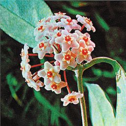 Это довольно крупная, мощно растущая лиана. Побеги слегка вьющиеся, гладкие и оголенные, по мере роста нуждаются в опоре. Растение можно оформить в виде любых декоративных решеток или просто натянуть проволоку между стволами сухого бамбука. Неподвязанные побеги свисают во все стороны и непригодны для создания композиции. В озеленении этот плющ используют разнообразно – в зависимости от направления роста побегов. Цветет плющ восковой с марта по октябрь (в комнатных условиях семян обычно не образует). Не рекомендуется трогать растение после того, как появились бутоны, да и нежелательно касаться самих бутонов. Лепестки цветков – опушенные, белые, но могут быть и слегка розоватыми. Венчик белый с красной серединой. Обычно в соцветии около 24 цветков, они держатся в течение нескольких недель.