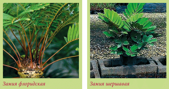 Растение двудомное, т. е. пыльниковые (микростробилы) и семенные (мегастробилы) шишки расположены на разных особях. Семена с мясистой сочной оболочкой.Замия кремнистая – Zamia silicea. Она является эндемиком кубинского острова Пинос. Это бесстебельное растение, с целиком подземным веретеновидным стеблекорнем и распластанными на почве двумя-пятью кожистыми листьями, каждый из которых включает всего 8–16 листочков. Замия кремнистая обитает во влажных саваннах и в редких и светлых тропических сосновых лесах. Она хорошо приспособлена к перенесению продолжительных засух и частых пожаров. Под действием того и другого отмирают ее листья, опадают «шишки», и замия продолжает жить за счет запасных веществ скрытого в почве стеблекорня до наступления благоприятного времени. Замия флоридская – Zamia floridana. Обитает в сосновых лесах, но уже не тропических, а субтропических, а также на коралловых рифах на севере ареала рода, во Флориде. Целиком подземный клубневидный ее стебель глубже переходит в морковеподобный главный корень, а над почвой среди листьев образуется стробил. У женских растений он нередко крупнее образовавшего его стебля и почти сидячий.