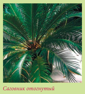 Цикас поникающий, или Саговник отогнутый – Cycas revoluta. Цикас поникающий отличается декоративными, изящно отогнутыми книзу перистыми листьями с узкими темно-зелеными листочками. Спороносные листья с желтым войлочным опушением, слегка изогнутые. Семена широкоовальные, длиной до 2 см, оранжево-красного цвета.