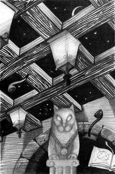 По краям камина размещались предметы, напоминающие кальян. На верхней части, на подставках, лежали длинные деревянные курительные трубки. В центре каминной плиты возвышался покрывшийся патиной бронзовый бюст с кошачьей головой.