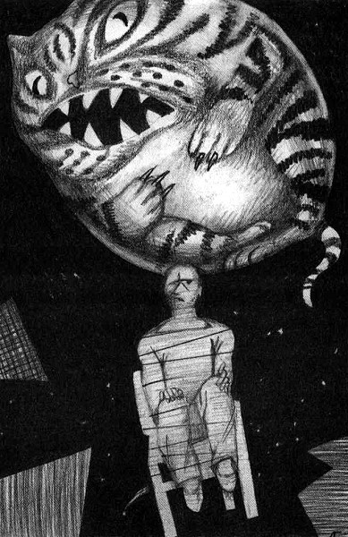 И вдруг он стал раздуваться, быстро увеличиваясь в размерах, как будто кто-то накачивал его воздухом мощным насосом. Глаза котика сначала стали ярко-желтыми, потом ярко-зелеными, потом красными… Он все увеличивался и увеличивался в размерах. Рот кота превратился в страшную пасть, полную мелких острых зубов, он взмахнул лапами и…