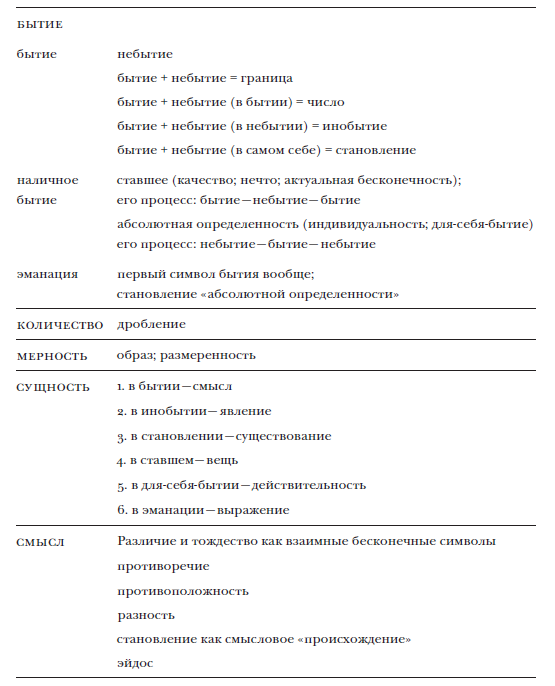 Небесполезной будет сводная таблица основных этапов категориальной жизни «самого самого». (Надо оговориться: текст оставляет возможность разной рубрификации категорий, и поэтому ниже представлены основные логические ступени без педантичного разбиения на используемые обычно Лосевым триады и пентады.)