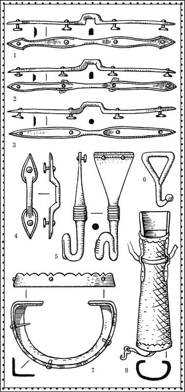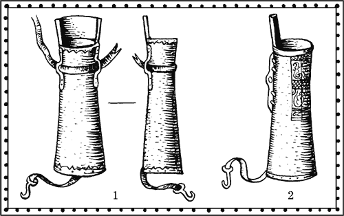 Заботой о сохранности стрел диктовалась и сама форма тула. Возле днища он расширялся до 12–15 см в поперечнике, посередине корпуса его диаметр составлял 8—10 см, у горловины тул вновь несколько расширялся. В таком футляре стрелы держались плотно, в то же время оперение их не сминалось, а наконечники при вытаскивании не цеплялись. Внутри тула, от дна до горловины, проходила деревянная планка: к ней ремешками прикрепляли костяную петлю для подвешивания. Если вместо костяной петли брались железные кольца, их приклёпывали. Тул мог быть украшен металлическими бляшками или резными накладками из кости. Их приклёпывали, приклеивали или пришивали обычно в верхней части тула.