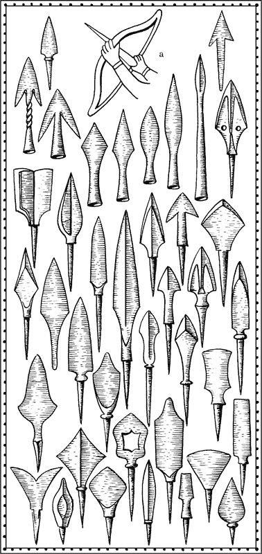 Художники почему-то больше всего любят «приделывать» к стрелам своих персонажей наконечники с двумя заострёнными шипами, оттянутыми назад. Вероятно, предполагается, что у таких наконечников наиболее грозный вид. Между тем в специальной литературе о древнеславянских луках и стрелах можно найти (было бы желание) подробнейшее описание… ста шести типов железных и восьми типов костяных наконечников, бытовавших в разные времена у славян. О каждом из этих типов написано, в какие века и в каких местностях он применялся и для какой именно цели. Какое подспорье и для романиста, и для иллюстратора! Почему не воспользоваться?..