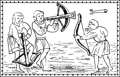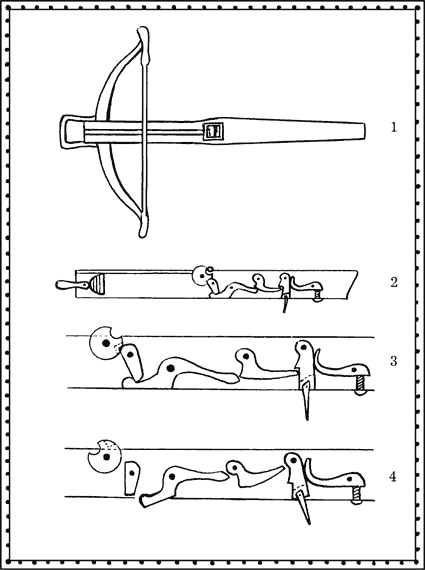 Самострел – это маленький, очень тугой лук, укреплённый на деревянном ложе с прикладом и желобком для стрелы – «болта самострельного». Тетиву самострела натянуть вручную для выстрела было исключительно трудно, поэтому его оснащали особым воротом – «коловоротом самострельным» – и спусковым механизмом.