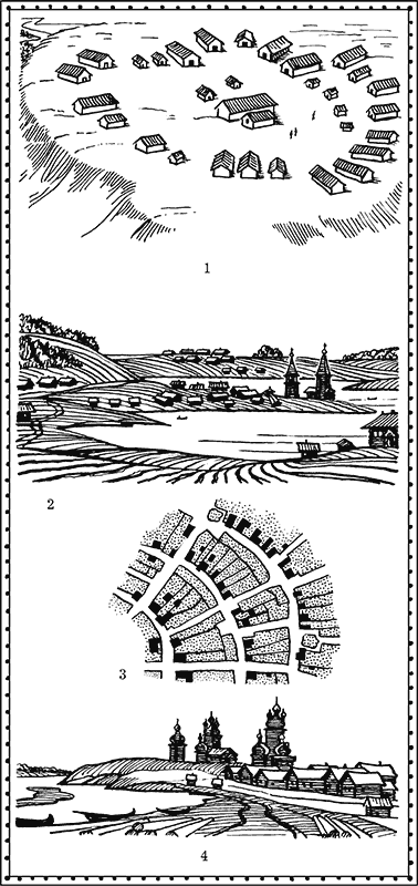 В главе «Древнейшие поселения» было рассказано, как с течением столетий внутри славянского рода обосабливались отдельные семьи и переселялись из большого общинного дома в собственное жильё. В VIII–IХ веках в лесной полосе нынешней России немало было таких поселений, представлявших собой целое «гнездо» жилых изб (иногда окружавших древний большой дом, только предназначенный теперь не для жилья, а для общинных работ) и чуть в стороне – хозяйственные постройки. Хозяйство при этом оставалось общим: существовали, например, общие погреба. Минули ещё века, община из родственной превратилась в соседскую: люди, жившие рядом, были уже не обязательно родственниками. Исчезли большие дома и общность хозяйства, но осталась планировка деревни, которую этнографы называют «кучевой» или «гнездовой». Такую планировку считают древнейшей. Дома стоят безо всякого порядка, видимого современному глазу, вокруг расположены пашни, выгоны, огороды…
