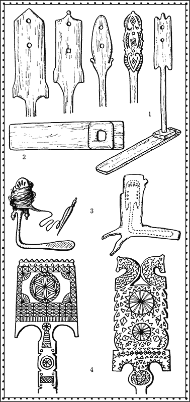 Собственно прялкам («пряслицам» по-древнерусски), древним и не очень, тоже посвящена обширная научная литература. Достаточно сказать, что орнаменты русских прялок даже ХIХ века буквально пестрят чисто языческими символами: «громовыми знаками», изображениями «белого света». Эти знаки можно видеть на иллюстрациях к главам «Перун Сварожич», «Даждьбог Сварожич».