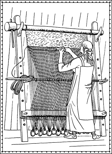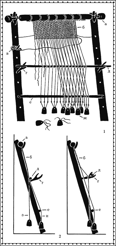 Подобный стан представляет собой П-образную раму (кросна) – два вертикальных бруса (или толстые жерди с развилками на верхних концах), соединённые наверху перекладиной, способной вращаться. К этой перекладине прикрепляются нити основы, а в дальнейшем на неё наматывают готовую ткань – поэтому в современной терминологии её называют «товарным валом». Раньше употреблялось более емкое и красивое древнее славянское слово «навой». В нижней части вертикальных брусьев расположен «нитеразделительный пруток»: нити основы, через одну, проводятся над ним или под ним. Свободные концы их подматываются, скрепляются в пухлые связки, и к связкам подвешиваются те самые гирьки, чтобы основа оставалась туго натянутой и ткань получалась плотной. Кросна ставились наклонно, так что часть основы, оказавшаяся за нитеразделительным прутком, отвисала, образуя естественный зев. Каждая из этих задних нитей подвязывалась петелькой к ещё одной поперечной палочке: такая деталь в современной терминологии – «ремизка», по-древнерусски – «нит». Когда нит лежит на раме, ткачиха пропускает уток в естественный зев. Когда нит оттягивают на себя и вставляют в специальную вилку, передние и задние нити основы меняются местами – возникает искусственный зев, и уток пропускается снова. Если ткань льняная, это простейшее переплетение называется «полотняным», если же ткётся шерстяная материя, переплетение называют «суконным». Однако нитов бывает несколько, комбинации нитей основы подбираются разные. Древние ткачи прекрасно знали и умели делать более сложные переплетения, например «саржевые» и «атласные».