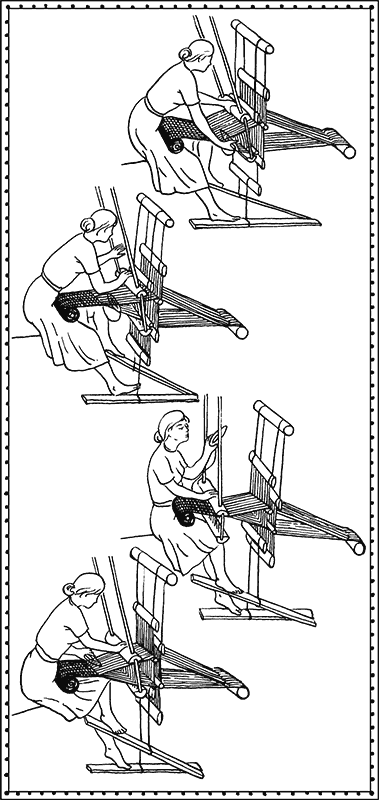 Наконец, нельзя не упомянуть ещё об одном, с позволения сказать, ткацком приспособлении: это – «живой стан». Исследователи пишут, что так ткали ленты и пояса, вероятно, ещё в эпоху матриархата, ибо этот способ требует участия не менее десятка женщин и большой дисциплины. Десять женщин, как и при «дёргании», надевали на пальцы петли основы и по команде меняли зев, а одиннадцатая протаскивала уток.