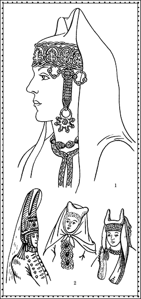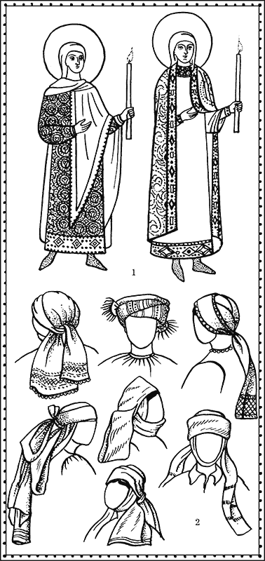 Иностранные писатели – современники древних славян, оставившие нам описание их обычаев, – упоминают, что жених накидывал своей избраннице на голову покрывало и делался таким образом её мужем и господином. Действительно, одни из древнейших славянских наименований головного убора замужней – «повой» и «убрус» – означают, в частности, «покрывало», «полотенце», «платок». «Повой» значит ещё «то, что обвивает». Вероятно, именно такой убор запечатлён на изображении древнерусской княгини, дошедшем до нас из ХI века. Судя по всему, сделан он из длинной – несколько метров – и достаточно широкой полосы белой материи, концы которой спускаются на спину. Аналогичный убор дожил до начала ХХ века кое-где на Украине и на западе Белорусии. Этнографы совершенно справедливо называют его «полотенчатым». А в русском языке сохранилось выражение «до повоя», имевшее смысл – «до замужества».