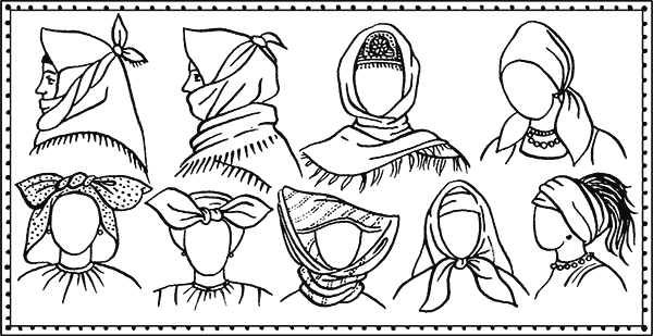 В холодное время года женщины всех возрастов покрывали голову тёплым платком. Только завязывался он не под подбородком, как мы привыкли. Такой способ, как пишут учёные, сравнительно недавно проник в Россию из Германии через Польшу. В древности платок охватывал подбородок и шею, а узел завязывали высоко на макушке. Такая манера носить платок сохранилась кое-где в России еще в начале ХХ века. «Не следует думать, что у этих женщин болят зубы», – комментирует свой документальный рисунок этнограф.