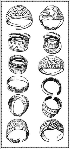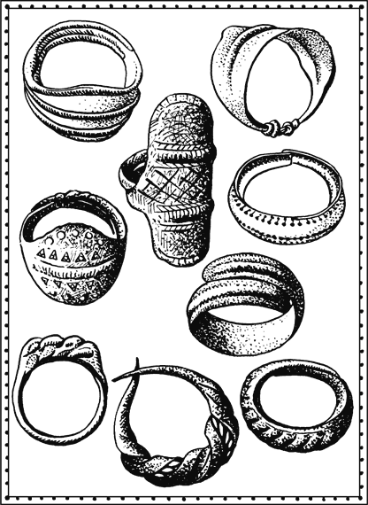 Другие украшения, изначально призванные магически охранять человеческую руку, – кольца, перстни – появляются в могилах древних славян с IХ века и широко встречаются начиная со следующего, Х века. Некоторые археологи полагали, что они получили распространение у славян только после введения христианства, ведь кольца играют важную роль в церковном обряде. Однако другими учёными были раскопаны славянские захоронения VII века (в Трансильвании), и там оказались бронзовые перстни – не привезенные из далёкой страны, а местные, притом позволяющие даже говорить о «славянском типе» перстней. Кольцо держит в руке и одно из Божеств Збручского языческого идола: исследователи узнали в нём изображение Лады – славянской Богини всеобщего порядка вещей, от космического круговорота созвездий до семейного круга (см. главу «Род и Рожаницы»). И на более поздних перстнях упорно просматриваются священные символы язычества, например знаки Земли. Словом, языческая символика кольца-перстня была никак не бедней христианской. А может, именно поэтому язычники избегали надевать перстни на покойных, опасаясь помешать душе покинуть тело и отправиться в загробное странствие (см. главу «Пояс»)? Если так, то следует предположить, что после принятия христианства в конце Х века, когда умерших, особенно знатных, всё чаще начали хоронить по христианскому обряду, кольца стали класть рядом с телом, а после – оставлять на руке…