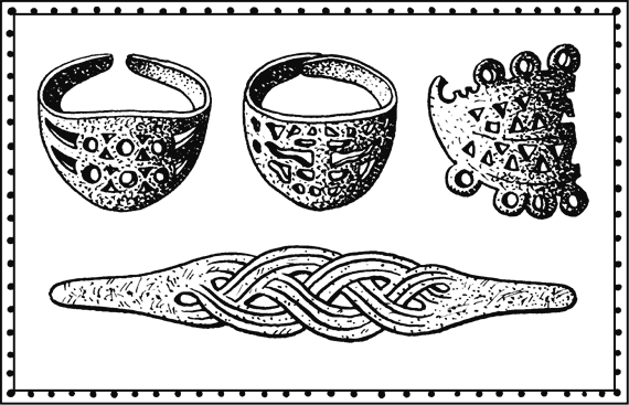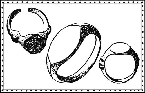 А вот на землях между Псковом и современным Санкт-Петербургом, где кривичи и словене смешивались с финно-угорскими племенами – ижорой и водью, – бытовали перстни с выпуклыми рубчиками на длинном щитке. Встречаются здесь и витые незамкнутые перстни, литые с имитацией витья, а также с печаткой, причём вполне «современного» вида. На печатках древнеславянских перстней можно встретить самые разные священные, оберегающие знаки, в том числе и свастику – катящееся солнечное колесо (подробнее см. в главе «Даждьбог Сварожич»).