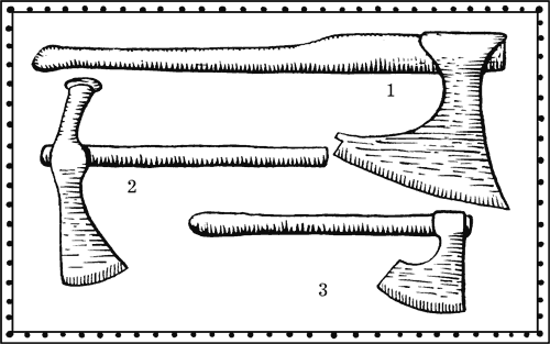 Ещё один вид боевых топориков – с характерной прямой верхней гранью и лезвием, оттянутым вниз, – чаще встречается на севере Руси, главным образом в районах со смешанным населением, где рядом жили славянские и финские племена. Учёные так и называют эти секиры – «русско-финскими». Топорики подобной формы, судя по археологическим данным, появились в Норвегии, Швеции и Финляндии ещё в VII–VIII веках. В Х—ХII веках они становятся типичными для Финляндии и северо-востока Руси.