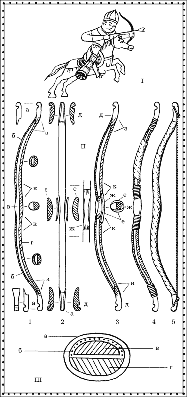 На рисунке художника показан древнерусский сложный лук, восстановленный учёными по большому обломку, найденному в Новгороде, в слое первой половины ХII века. Как выяснилось, эта находка аналогична более ранним (VIII век), но гораздо лучше сохранилась благодаря влажной глинистой почве. Новгородский обломок, найденный в 1953 году, представляет собой почти половину целого лука, одно из его плеч-рычагов. Пролежав в земле восемь веков, плечо лука по-прежнему было способно пружинить.