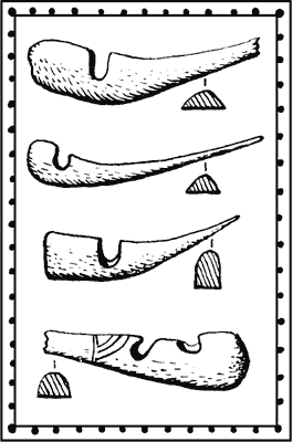 Костяные накладки прикреплялись и на концах лука, там, где надевалась петля тетивы. Вообще, костяными накладками старались укрепить те места лука (их называли «узлами»), куда приходились стыки его основных частей – рукояти, плеч (иначе рогов) и концов. После наклейки на деревянную основу костяных накладок их концы приматывались опять-таки сухожильными нитями, пропитанными клеем.