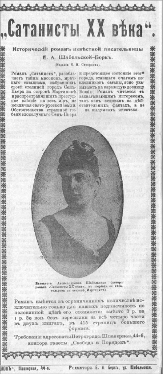 Вторая часть романа «Сатанисты ХХ века» похожа на научную фантастику. Действие происходит в городе Сен-Пьер на острове Мартиника в Карибском море, захваченном масонами. Тут тебе и вещающая статуя Люцифера, и загадочный сын сатаны, и еврейские магические эксперименты, и христианский негр-колдун, и Божье провидение. Оно-то и кладет конец всем творящимся в Сен-Пьере безобразиям (а вместе с ними и роману): город с жителями гибнет в лаве вулкана. Роман Шабельской печатался фельетонами в журнале «Колокол». Александр Амфитеатров написал об этом романе: «Это любопытнейшие “человеческие документы” не для рядового читателя, но для внимательного психиатра… В каждой строке чувствуется галлюцинатка, в которой морфий окончательно парализовал работу сдерживающих центров…»