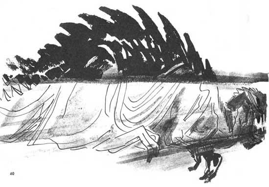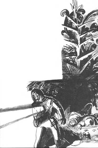 …Руссов останавливался через каждую сотню метров. Его сердце отчаянно колотилось, не хватало дыхания, каждый новый шаг вперед был мучительной пыткой. Нечеловеческие усилия, которые он прилагал, чтобы тянуть вперед неимоверно тяжелый «поезд» с астронавтами, вскоре окончательно истощили его. Мускулы ног и рук отказывались повиноваться. Он впервые пожалел, что в последние месяцы перед отлетом нерегулярно посещал Дворец Здоровья и Силы, поддавшись меланхолии. Лямка невыносимо резала плечи, плотно вдавившись в упругую ткань скафандра. Но он шел, тяжело переставляя ноги, делая в час не более километра, так что его могла бы легко обогнать черепаха. Лесу, казалось, не будет конца. Он потерял представление о времени и месте, но всё шел и шел, спотыкаясь, падая, вставая, чтобы сделать два-три судорожных рывка вперед, и снова падая. Наконец, он упал, попробовал подняться и не смог. Тяжелый сон сковал его усталое тело.