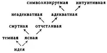 «Отчетливое познание имеет степени» (3, с. 88), и достижение более высоких из них требует дальнейшего разделения идей. Нужно отсеять «неадекватные идеи», в которых строгого перечисления всех признаков предмета достигнуть не удалось и которые познаются нами в спутанном, даже неполном виде. Зато в идее «адекватной» мы обладаем полным познанием в том смысле, что анализ отчетливо познаваемых нами признаков, например, некоторого числа доведен до осмысления и формулировки каждого из них (3, с. 40; 4, с. 233). Адекватному познанию, по мнению философа, свойственны всеобщность, строгая четкость и направленность на раскрытие возможностей вещей, т. е. диспозиций их развития. Делится же оно на два вида, из которых первый имеет дело с «символизируемыми» идеями, а второй — с идеями «интуитивными» (в смысле рациональной интуиции).