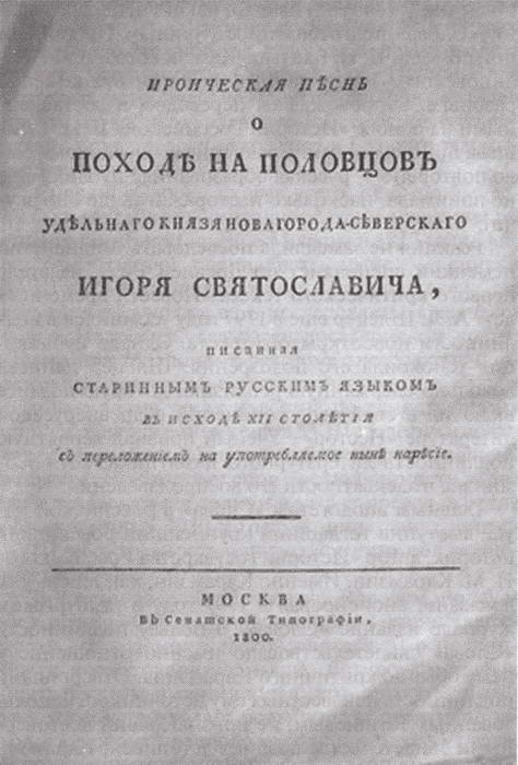 Образованная Россия впервые получила возможность прочесть «Слово о полку Игореве» в 1800 году, когда графом Алексеем Ивановичем Мусиным-Пушкиным, известным антикваром, была выпущена «Ироическая песнь о походе на половцев удельного князя Новогорода-Северского Игоря Святославича». Обстоятельства обнаружения, издания и гибели рукописи «Слова» многократно описаны и хорошо известны {2} , поэтому ограничимся напоминанием основных вех.