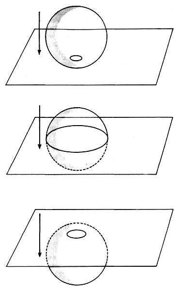 Любые обсуждения третьего измерения строго запрещены. Каждого, кто упомянет о нем, ждет суровое наказание. Мистер Квадрат — самодовольный и уверенный в своей правоте флатландец, которому и в голову не приходит указывать истеблишменту на несправедливость. Но однажды его жизнь круто меняется раз и навсегда: ему наносит визит таинственный лорд Сфера, трехмерное тело. Лорд Сфера предстает перед мистером Квадратом как окружность, волшебным образом способная менять размер (рис. 3.1).
