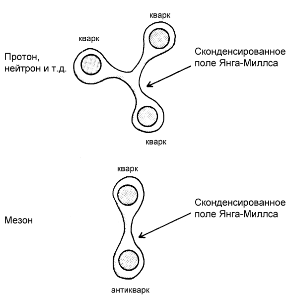 Рис. 5.3. Частицы, между которыми есть сильное взаимодействие, в действительности состоят из еще более мелких частиц, которые называются кварками. Они связаны друг с другом вязким «клеем», который описан полем Янга-Миллса. Протон и нейтрон состоят из трех кварков каждый, а мезон — из кварка и антикварка.