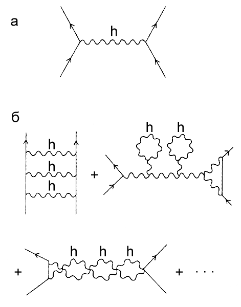 Рис. 6.1. а — в квантовой теории квант гравитационной силы, обозначенный буквой h и называемый гравитоном, образован при разложении риманова метрического тензора; согласно этой теории, объекты взаимодействуют, обмениваясь порциями гравитации. Таким образом, мы полностью теряем прекрасную геометрическую картину Эйнштейна; б — к сожалению, число схем с петлями бесконечно, что препятствовало объединению гравитации с квантовой теорией на протяжении последних пятидесяти лет. Квантовая теория гравитации, объединяющая ее с другими видами взаимодействия, — святой Грааль физики.