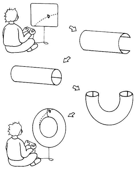 Мы превратили лист бумаги в фигуру, похожую на бублик. Можно сказать, что ракета, перемещающаяся по экрану в видеоигре, движется по внутренней поверхности трубки. Всякий раз, когда ракета исчезает с экрана и вновь появляется с другой стороны, это соответствует пересечению ракетой склеенного стыка внутри трубки.