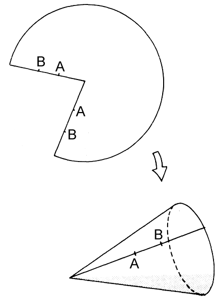 Рис. 9.3. Если мы соединим точки А и В, то получим конус — простейший пример орбиобразия. В теории струн наша четырехмерная Вселенная может иметь шестимерную пару с топологией орбиобразия. Однако шестимерная Вселенная так мала, что не поддается непосредственному наблюдению.