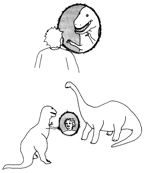 Что при этом видят динозавры? Они видят две судорожно машущие крошечные ручонки, высунувшиеся из окна с обеих сторон. А остального тела нет (рис. 10.4).