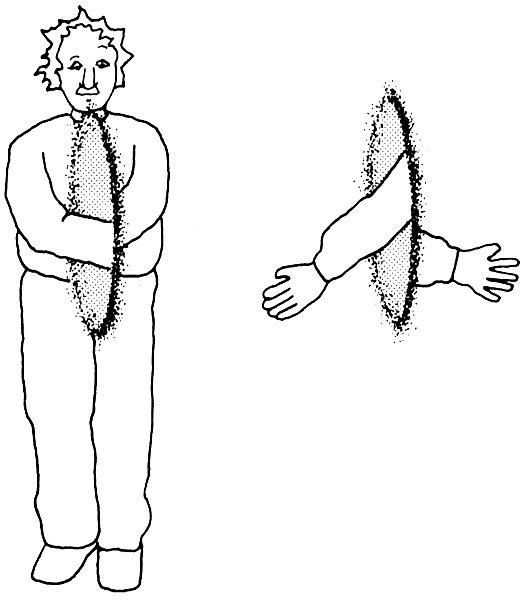 Ветер вдруг меняет направление, и шляпа летит в другую сторону. Вы просовываете в окно вторую руку, но уже с другой стороны. И попадаете в неловкое положение: обе ваши руки засунуты в окно, но с разных сторон. Вы не видите собственных пальцев, вам кажется, что обе руки исчезли.
