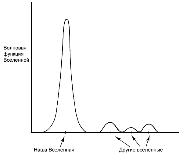 Согласно этой картине волновая функция Вселенной распространяется во всех возможных вселенных. Подразумевается, что эта волновая функция довольно велика вблизи нашей Вселенной, следовательно, есть немалая вероятность, что наша Вселенная и есть та, которая нам нужна, чего и следовало ожидать. Но волновая функция распространяется и на все остальные вселенные, в том числе безжизненные и несовместимые с привычными нам законами физики. Поскольку волновая функция предполагается для этих прочих вселенных исчезающе малой, мы не рассчитываем, что наша Вселенная сделает квантовый скачок к ним в ближайшем будущем.